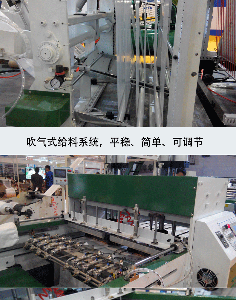 *吹氣式出料系統(tǒng),袋底整型設(shè)計(jì),自動(dòng)沖床采用油壓控制,廢料集中輸送收集,易于整理,操作簡(jiǎn)單,具有無(wú)料、斷料、堵料自動(dòng)停機(jī)功能。